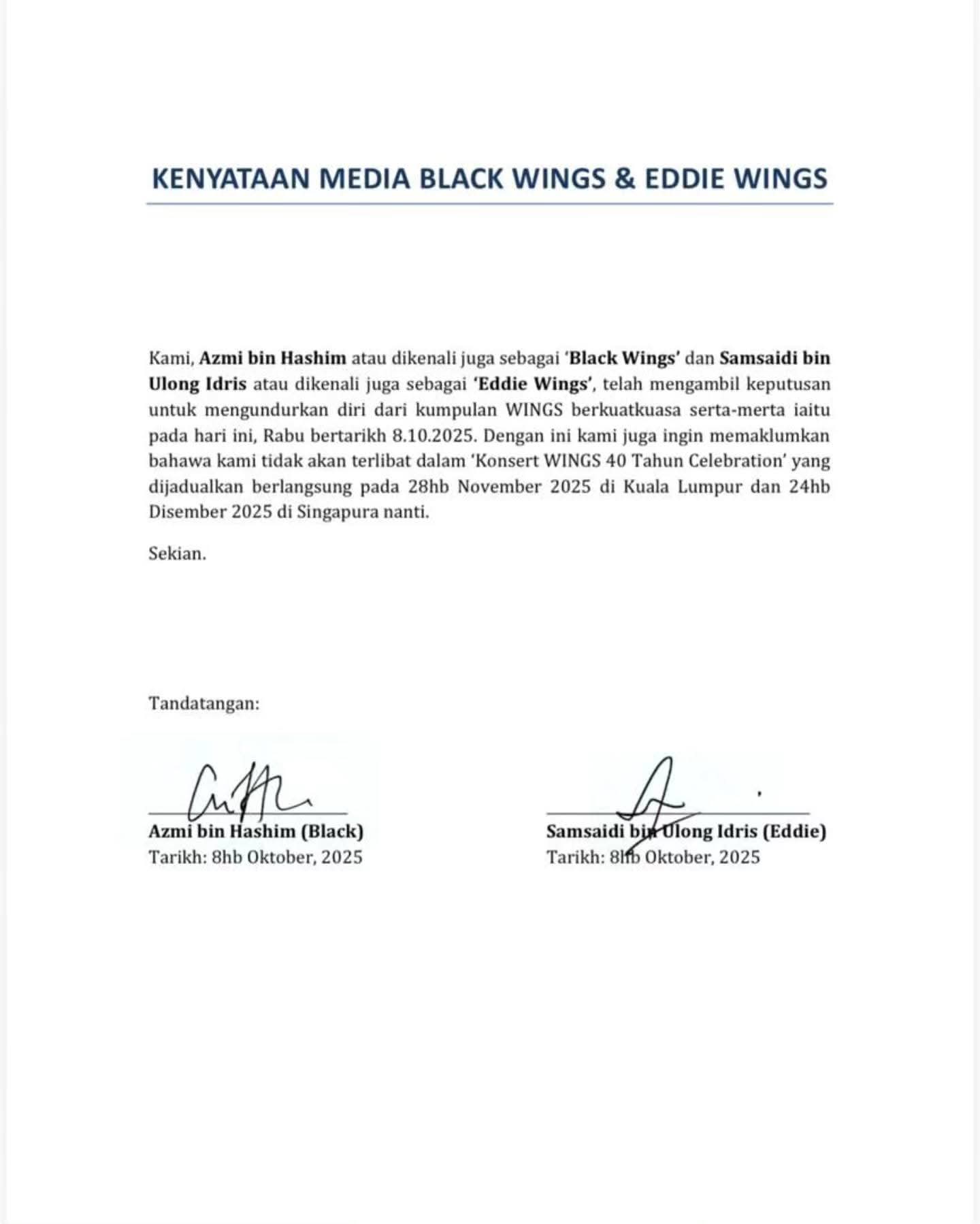 Dunia peminat rock tanah air dikejutkan dengan pengumuman rasmi daripada dua anggota terkemuka kumpulan WINGS, iaitu Azmi bin Hashim, lebih dikenali sebagai ‘Black Wings’, dan Samsaidi bin Ulong Idris, atau dikenali sebagai ‘Eddie Wings’. Kedua-duanya hari ini mengumumkan keputusan untuk mengundurkan diri daripada kumpulan legenda WINGS berkuatkuasa serta-merta.