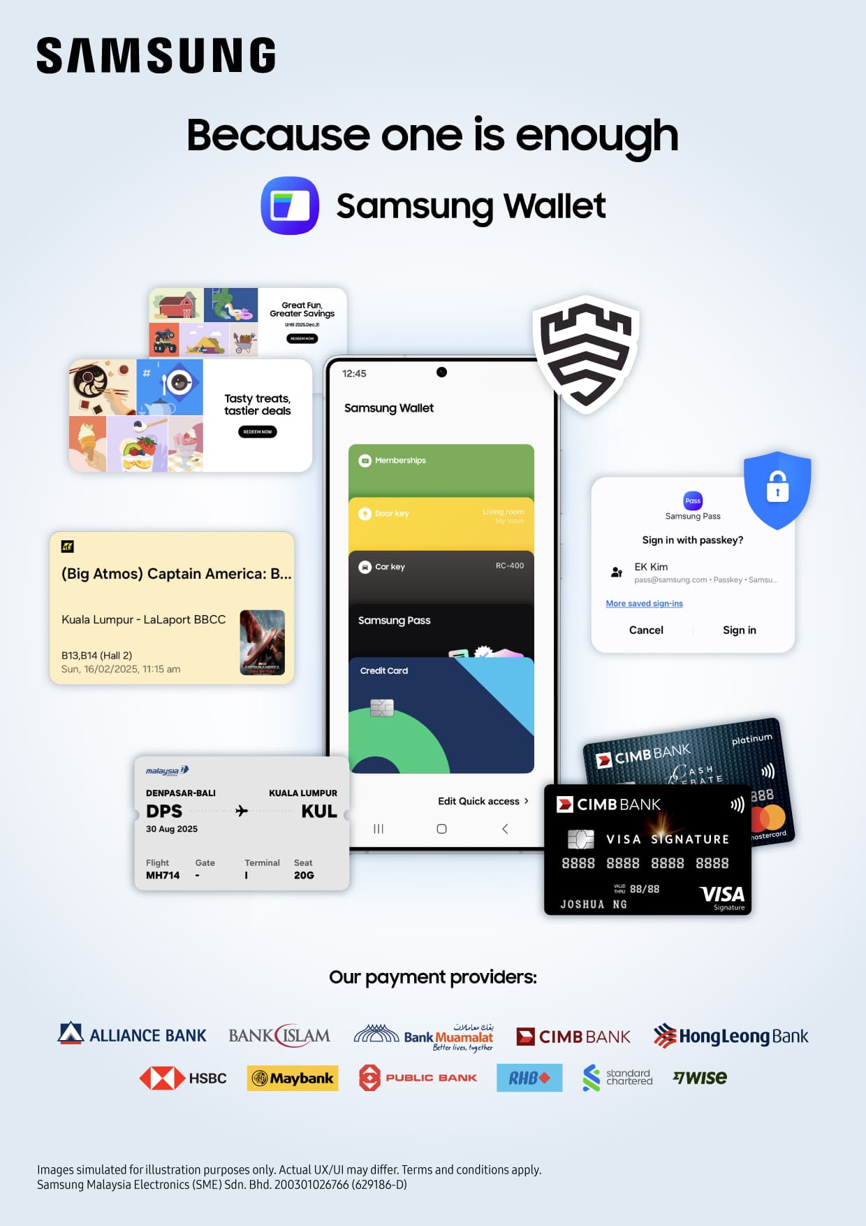 Samsung Wallet continues to evolve with new capabilities designed for local lifestyles. Bank Islam MasterCard users can now add their cards to Samsung Wallet, earning points with every transaction. To celebrate, Bank Islam is rewarding customers with extra TruPoints when they spend using Samsung Pay. Samsung Pay will be accepted by online merchants through Fiuu, Malaysia’s first payment processor to enable this feature. The rollout begins with 300 merchants, including Al-Ikhsan Sports, A&W, Beacon Mart, Healthland, Loudspeaker, and many more. Consumers can now add their GSC tickets to Samsung Wallet for quick and seamless access at cinemas. Travelers can add their Malaysia Airlines boarding passes directly into Samsung Wallet, ensuring a smoother and more convenient travel experience.