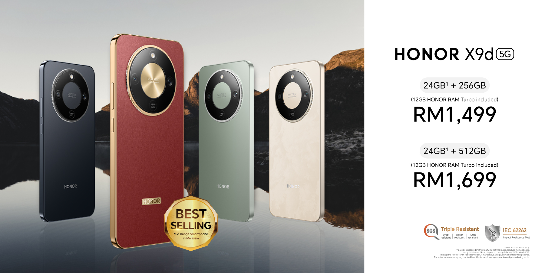 The HONOR X9d 5G is available in two variants: 24GB RAM with 256GB storage for RM1,499 and 512GB storage for RM1,699. The device comes in four premium colors: Reddish Brown, Forest Green, Sunrise Gold, and Midnight Black. The smartphone can be purchased at HONOR Experience Stores, HONOR online store, as well as Lazada, Shopee, and TikTok flagship stores. It is also available through authorized dealers such as Harvey Norman, Senheng, SenQ, and Urban Republic.