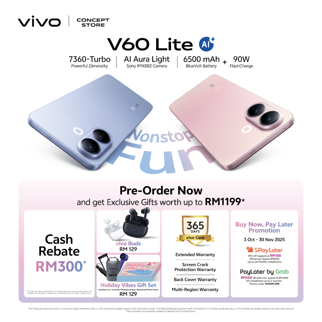Customers can get their hands on the vivo V60 Lite 5G from RM1,199 for the 8GB + 256GB and RM1,499 for 12GB + 512GB. Pre-order now to unlock exclusive rewards worth up to RM1,199, including free vivo Buds, a Holiday Vibes Gift Set, 1+1 year extended warranty, 1-year screen crack protection, 1-year back cover warranty, and multi-region warranty for added peace of mind. vivo Malaysia also offers flexible payment options such as RM100 extra savings with Grab PayLater or sPayLater, 0% installment plans for up to 24 months, and additional trade-in savings when you exchange any old phone. Don’t miss your chance to own the vivo V60 Lite 5G with unbeatable rewards. Visit your nearest vivo Concept Store today or find out more at https://www.vivo.com/my. vivo Malaysia remains committed to advancing design and technology that enrich the everyday experiences of its users, and the vivo V60 Lite 5G represents a continuation of this commitment by seamlessly merging powerful entertainment features with durable engineering and intelligent innovation.